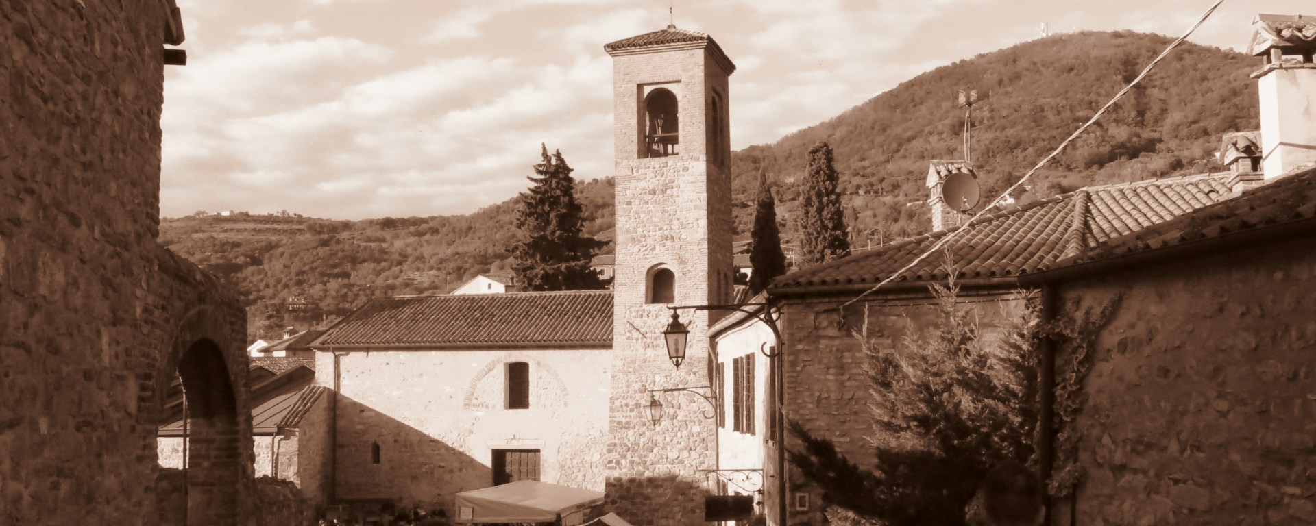 Dopo aver parcheggiato in poco tempo si raggiunge Piazza Petrarca, il centro della parte bassa del borgo, percorrendo il lungo viale pedonale in salita che termina con un caratteristico arco d’accesso.