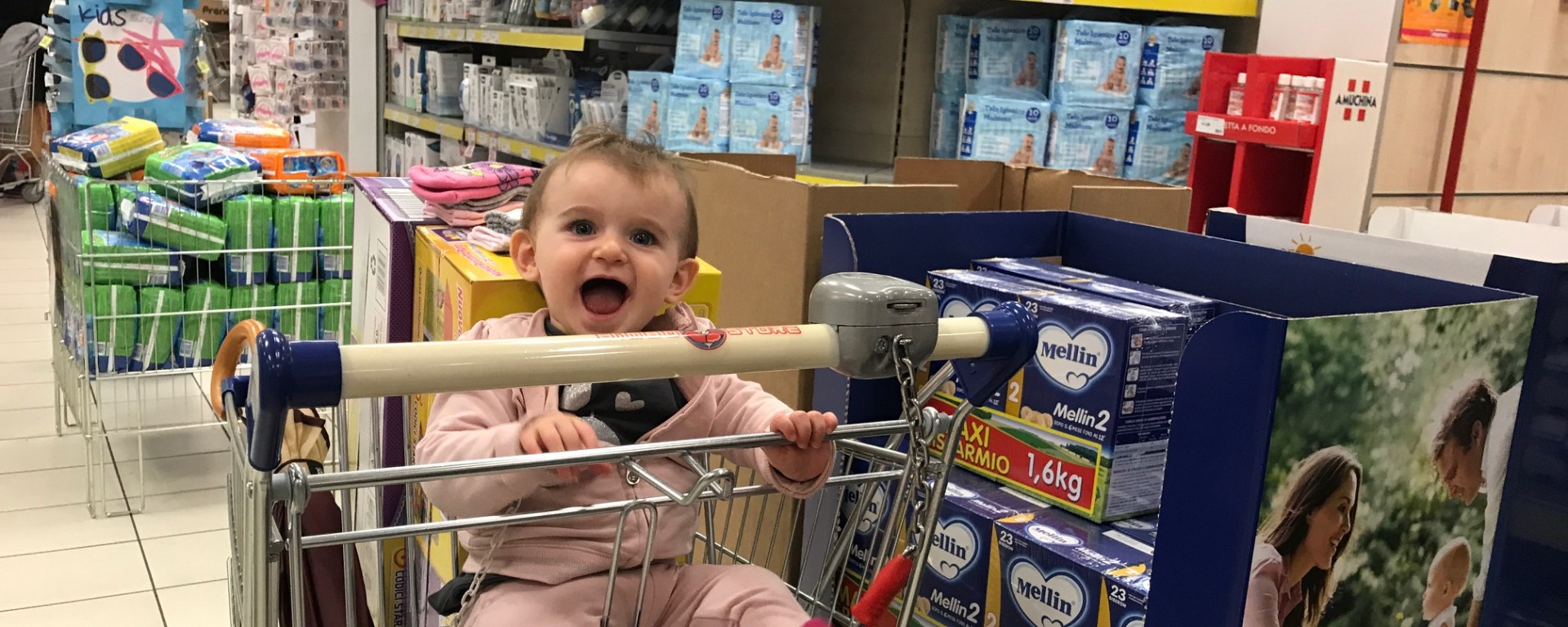 “Yuhuuuuu! Vai papà, spingi con quel carrello… veloce veloce! Vai vai, come a Montecarlo! Ferma ferma: sì sì, prendi questo latte, me imbriago!