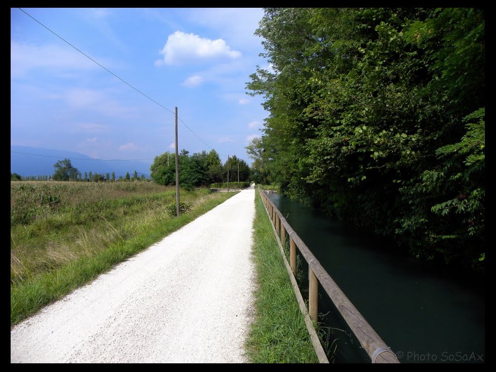 Il sentiero è lontano dal traffico, ma qua e là si scorgono i campanili dei paesi. Dopo circa 4 km di cammino si giunge ad una locanda, di cui non ricordiamo il nome. Si trova sulla sinistra in concomitanza di uno dei tanti incroci con le prese che vanno su al Montello, non ci si può sbagliare.
