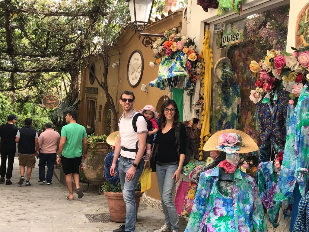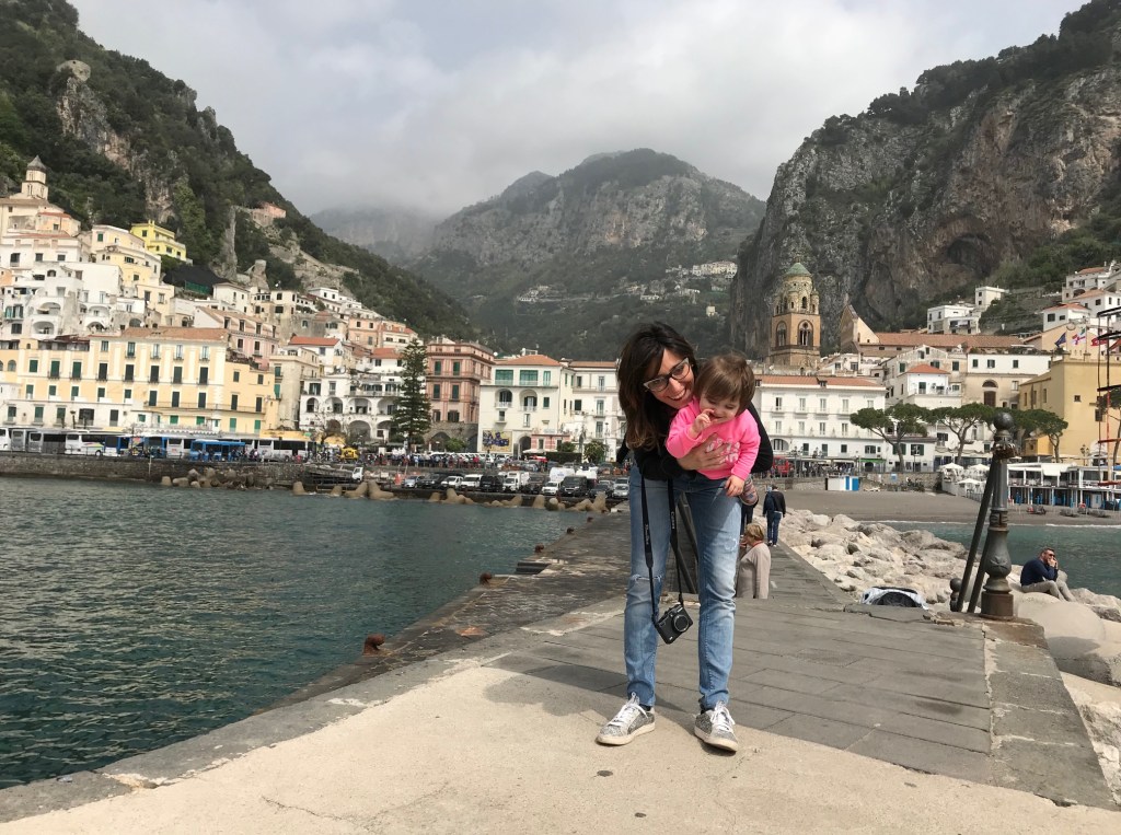 Positano ha la fortuna di essere molto più bassa rispetto alla statale costiera, per cui risulta un po’ più isolata. Per i camminatori vale la pena parcheggiare lungo la strada (3€ l’ora), per i più pigri c’è un parcheggio vicino al centro. Una meravigliosa scalinata scende dal colle fino al centro: impossibile da fare con i passeggini, noi ne abbiamo approfittato per usare lo zainetto della Stokke. Lizzie si è abbarbicata nello zainetto e ha iniziato a guardare a destra e sinistra per cercare di captare ogni immagine, colore, rumore di questo nuovo piccolo borgo. La discesa al mare è ripida e avventurosa: ci sono scalini ovunque e ad ogni svolta è uno scorcio improvviso e colorato: glicini in fiore, ringhiere colorate di azzurro e rosa, balconi fioriti, ce n’è per tutti i gusti. Proprio all’ingresso della strada di Positano iniziano i negozi tipici di vestiti, porcellane e prodotti alimentari (limoni, sfogliatelle, babà): siamo proprio arrivati in Costiera! Lugo la strada ci sorprende il contrasto fra la ricchezza del paesaggio e la scarsa cura degli edifici e delle strade. E scopriremo l’indomani che Positano è una vera perla rispetto ad altre realtà, ad esempio la “periferia” di Amalfi. Non ha prezzo perdersi per le stradine di Positano, fra negozietti e fiori profumati: indimenticabile il tetto di glicini che sovrasta la strada poco prima di sbucare nel sagrato della Chiesa, a due passi dal mare. Quando arriviamo in spiaggia ci sorprendono delle onde alte e schiumose, come quelle delle mareggiate invernali. Siamo all’inizio della primavera ma il sole picchia forte e fa caldo, complice anche la sabbia nera vulcanica della lingua di costa di Positano. Compriamo un cappello di paglia e un vestito rosa n stile Positano per Elisabetta (che si guarda allo specchio ridendo), ci gustiamo un caffè in un bar pieno di napoletani agguerriti che guardano la partita del Napoli e poi ce ne torniamo alla macchina.