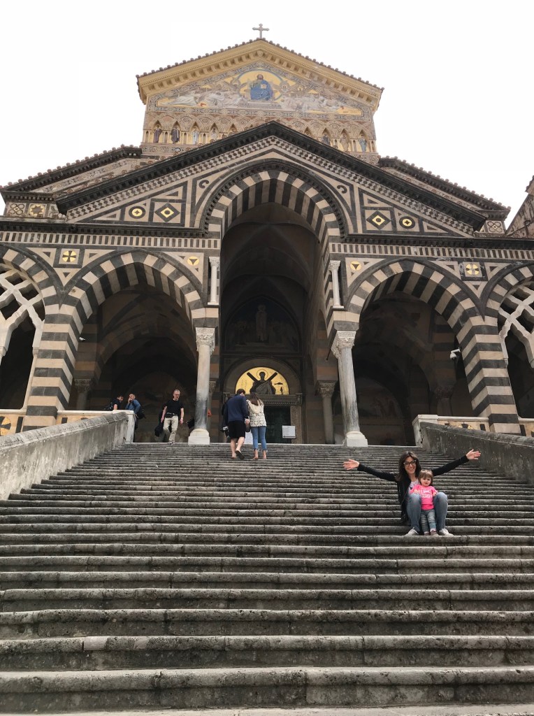 Suggeriamo di parcheggiare nel grande parcheggio interrato (3 € l’ora). Facile da girare con il passeggino, grazie all’assenza di gradini. Abbiamo percorso la via centrale (peccato ci passino le macchine): ci è parsa una via carina, di certo sovrastata dalla cattedrale che con la sua gradinata invita ad andare a visitarla. Dopo la foto di rito sui gradini ci avventuriamo nella cattedrale, il cui ingresso è a pagamento e prevede un tour “obbligato” di chiostro, cripta e anche della basilica. E’ forte il contrasto fra lo stile ricco della cripta e quello spoglio della basilica. Terminato il tour siamo andati verso l’alto, seguendo la strada principale, che culmina fino ad una terrazza con vista panoramica. Il paesaggio è davvero suggestivo: ai pigri suggeriamo di prendere l’ascensore del parcheggio “Luna Rossa” che conduce direttamente in cima alla terrazza evitando i gradini. La terrazza si trova in prossimità del cimitero.