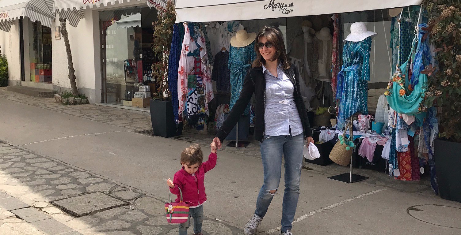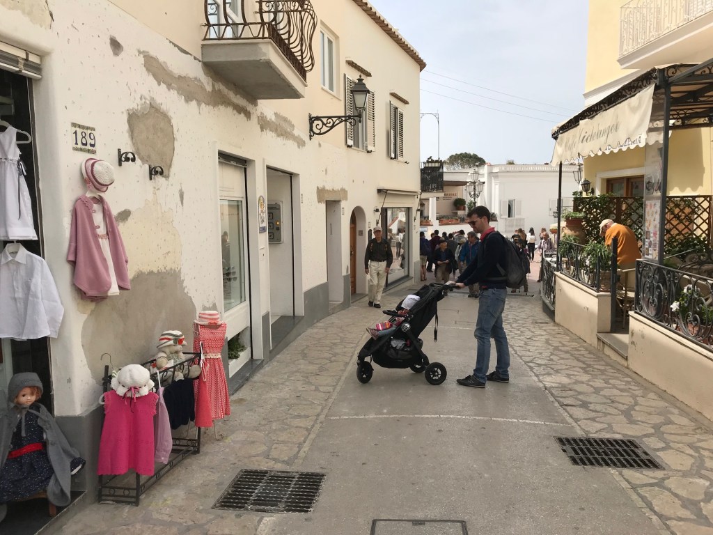 Prendiamo il traghetto da Amalfi. Ce ne sono diversi: noi abbiamo scelto quello che partiva alle 9.30 e che rientrava alle 17. Il traghetto costeggia la costa, facendo tappa a Positano. Il viaggio dura circa 1.20 h. Nel nostro caso è stato “il viaggio della speranza”: il mare era mosso e andavamo contro le onde, siamo usciti shakerati! Lizzie ha dormito durate tutto il viaggio e al risveglio eravamo già sbarcati a Capri.