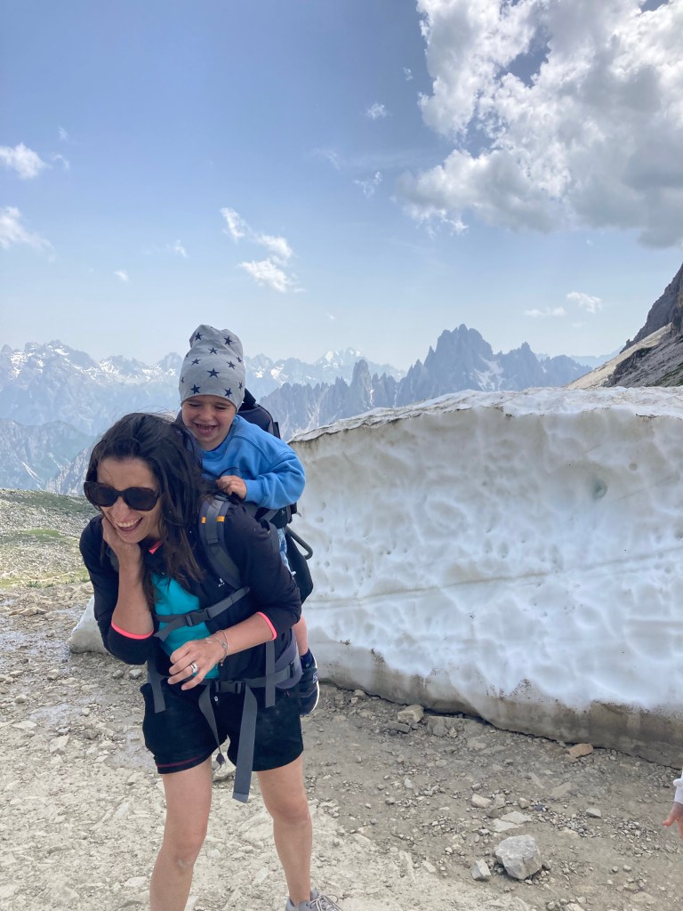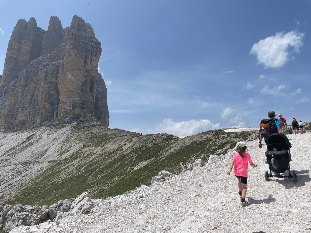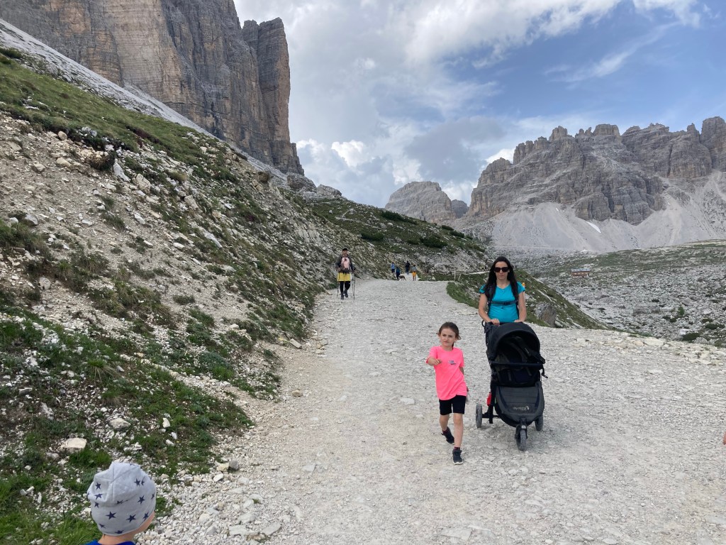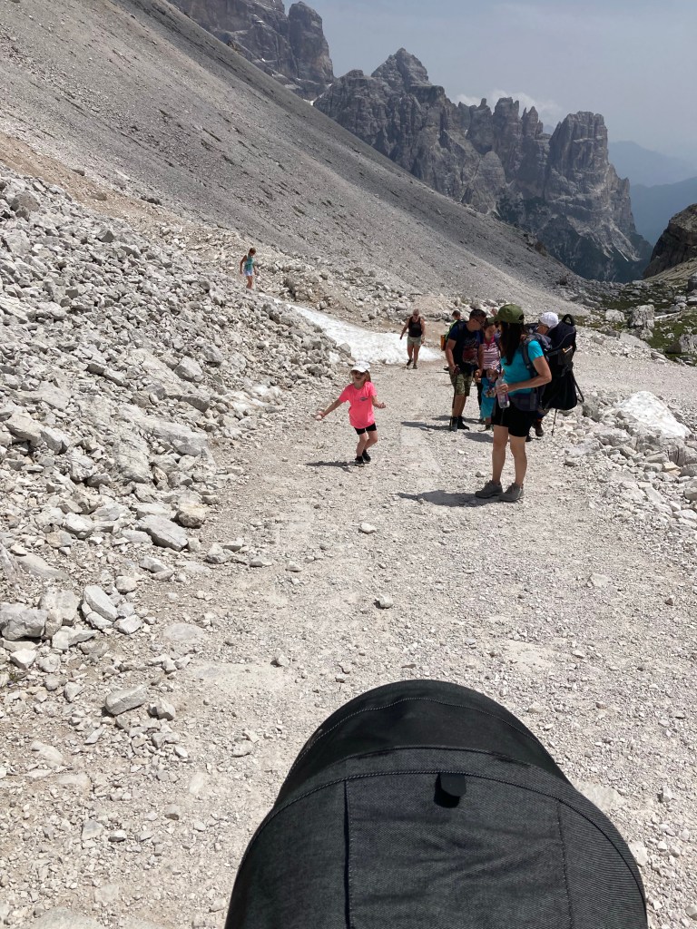 Dal rifugio parte una salita molto tosta verso forcella Lavaredo: prendete il sentiero basso, ha una pendenzainferiore. Con il passeggino è faticoso, ma non impossibile andare avanti: arrivate alla forcelle e poi procedete quel tanto che basta per vedere le Tre cime frontali.