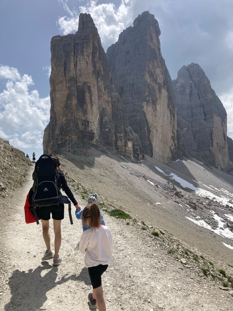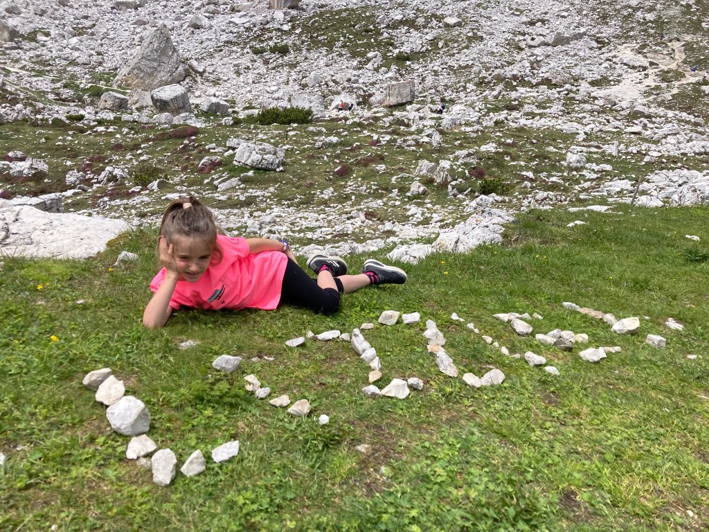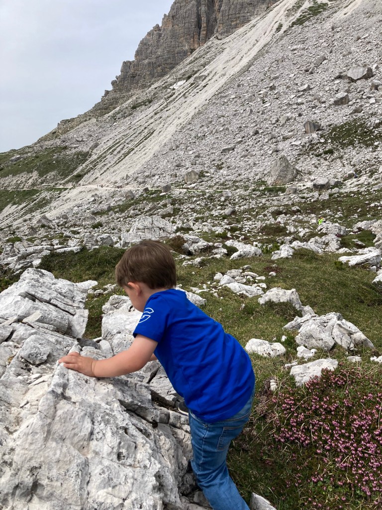 Il giro orario è impraticabile con i passeggini, e comunque di media difficoltà anche con i bimbi. Quindi optiamo per andare al rifugio Lavaredo, prendendo il sentiero 101. Si percorre una strada sterrata con la quale, sempre in piano, si arriva prima ad una chiesetta e poi in circa 35-40 minuti al rifugio Lavaredo.