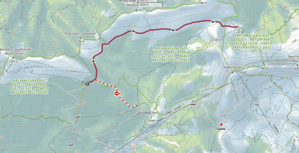 Punto di partenza: funivia Resciesa (Ortisei) – parcheggio agli impianti di risalita Seceda (8€). Ma meglio ancora se vi muovete con i mezzi. La piazza centrale di Ortisei è ben collegata con gli impianti di risalita tramite una rete di scale mobili ed un tunnel