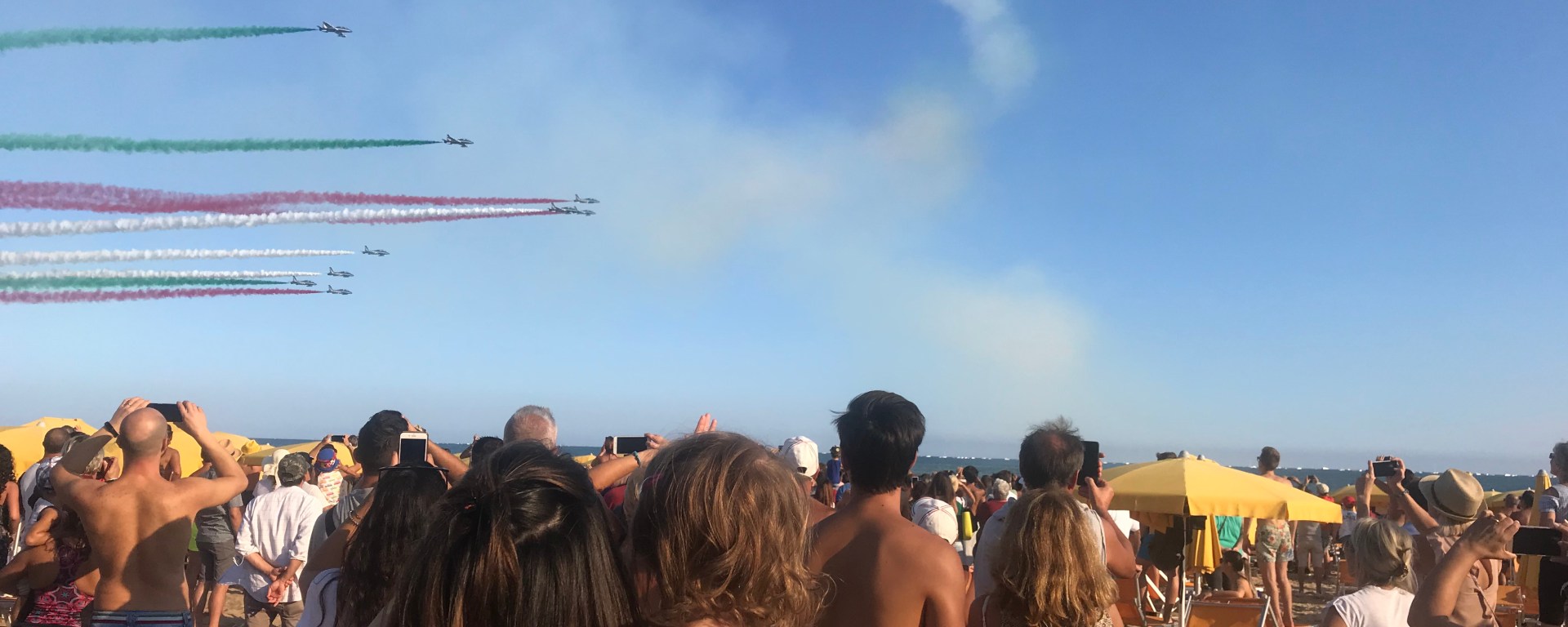 La domenica la spiaggia si riempie fin dal mattino: la spiaggia libera vicino a piazza Brescia è quasi interamente occupata dalle gradinate e lo spazio rimanente già a mezzogiorno è pieno. Noi preferiamo rimanere a casa fino al primo pomeriggio ed arrivare in spiaggia per le 16.00, a spettacolo già iniziato (le frecce tricolori sono solitamente verso le 17:00, prima ci sono diverse esibizioni).