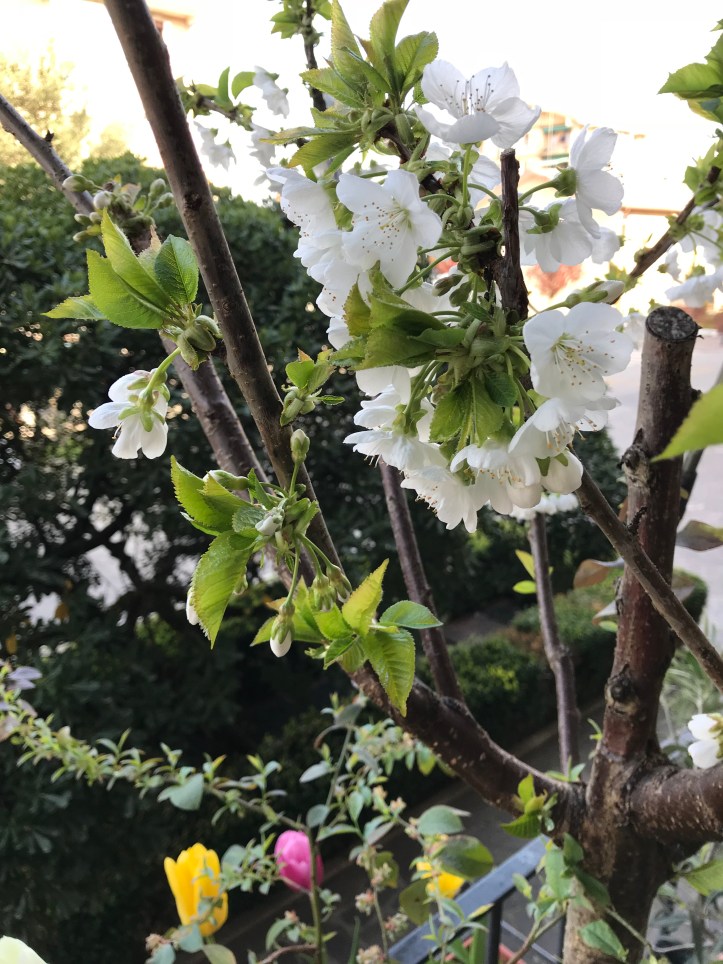 Il ciliegio: per ora non possiamo dire molto. In due anni non ci ha dato grandi soddisfazioni, nè a livello di fiori che di frutti. Ma saremo pazienti.