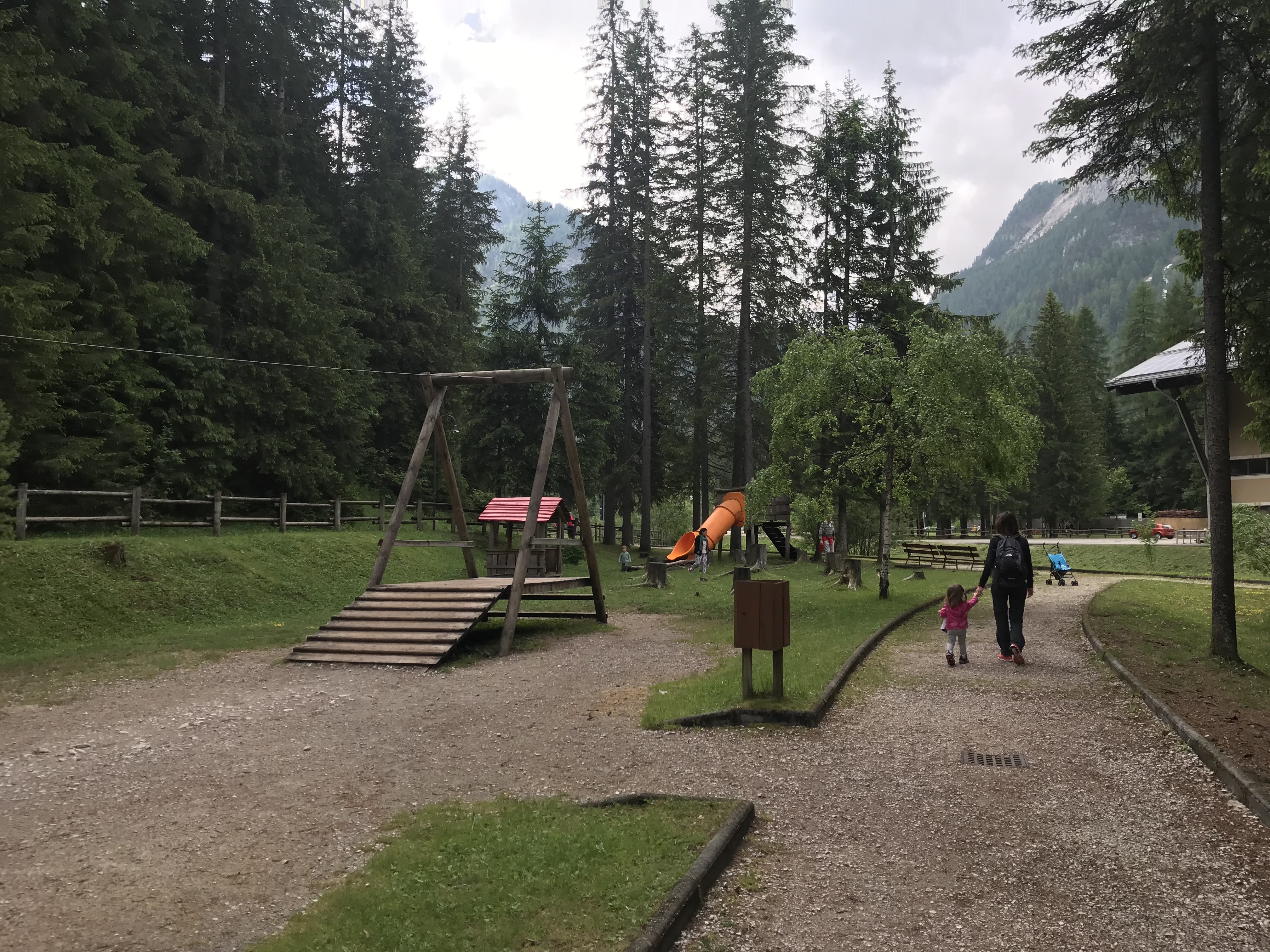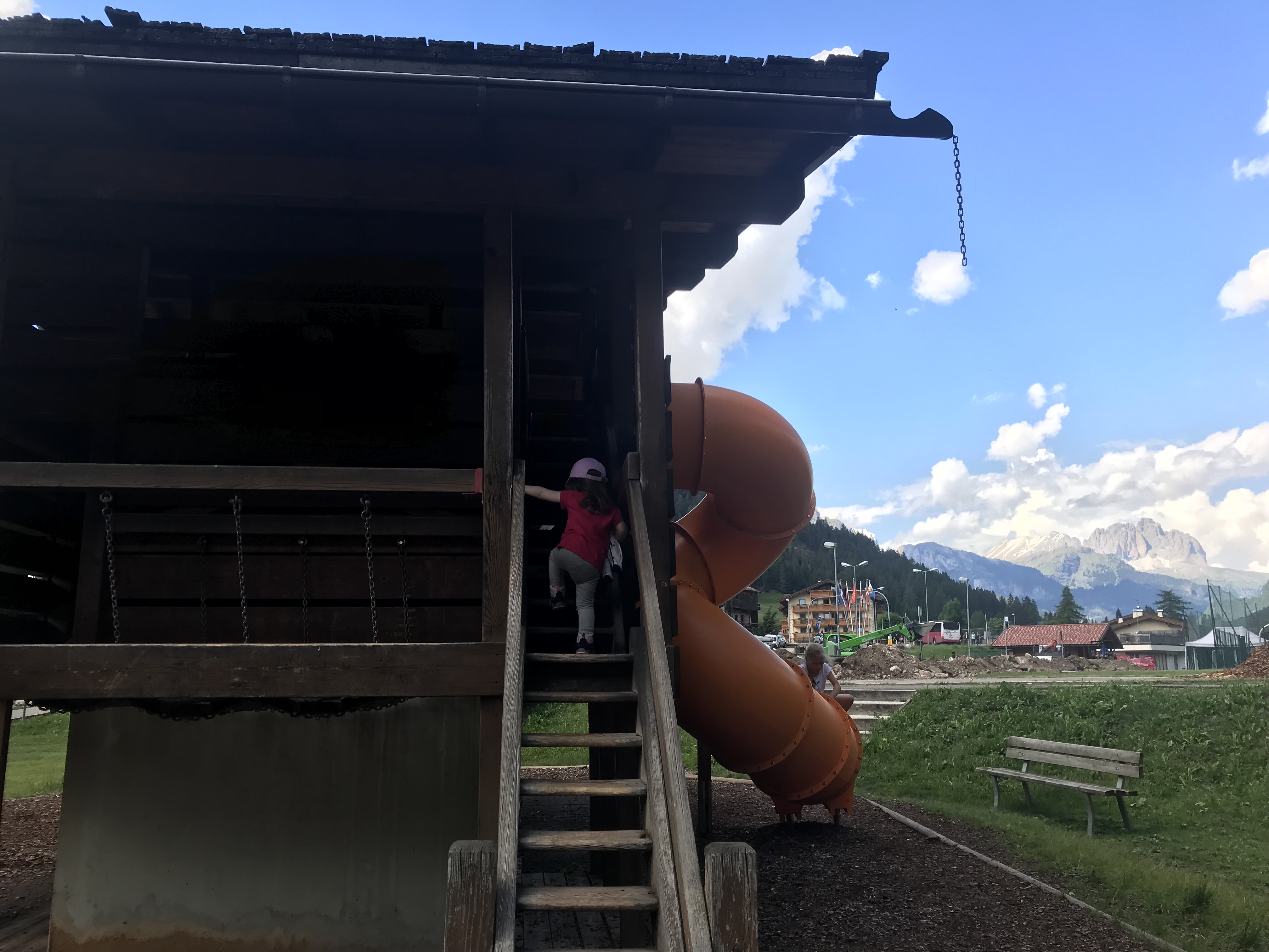 L’autobus ci lascia al palazzetto del ghiaccio di Alba di Canazei, poco lontano dalla funivia che porta al Col de Rossi. Qui facciamo subito sosta per una merenda al parco giochi.