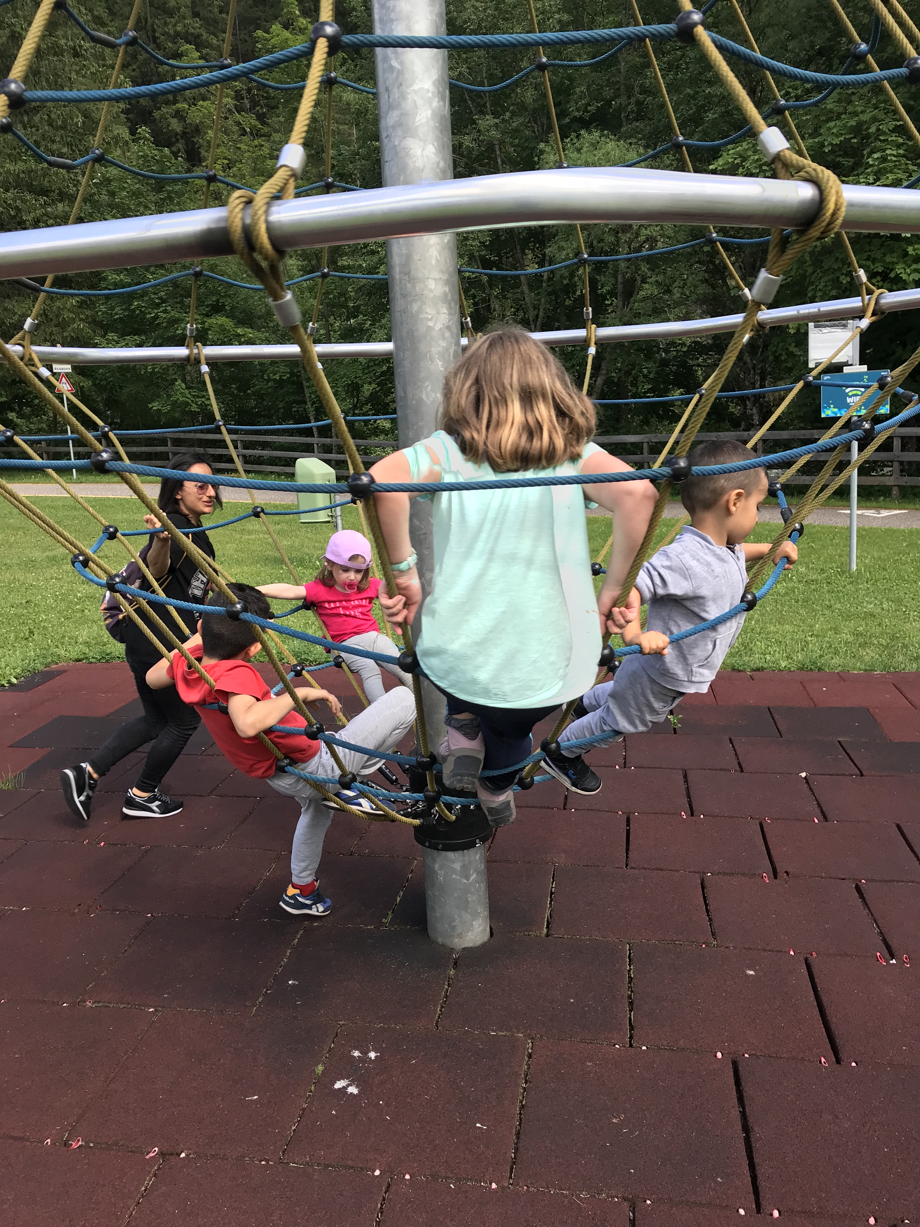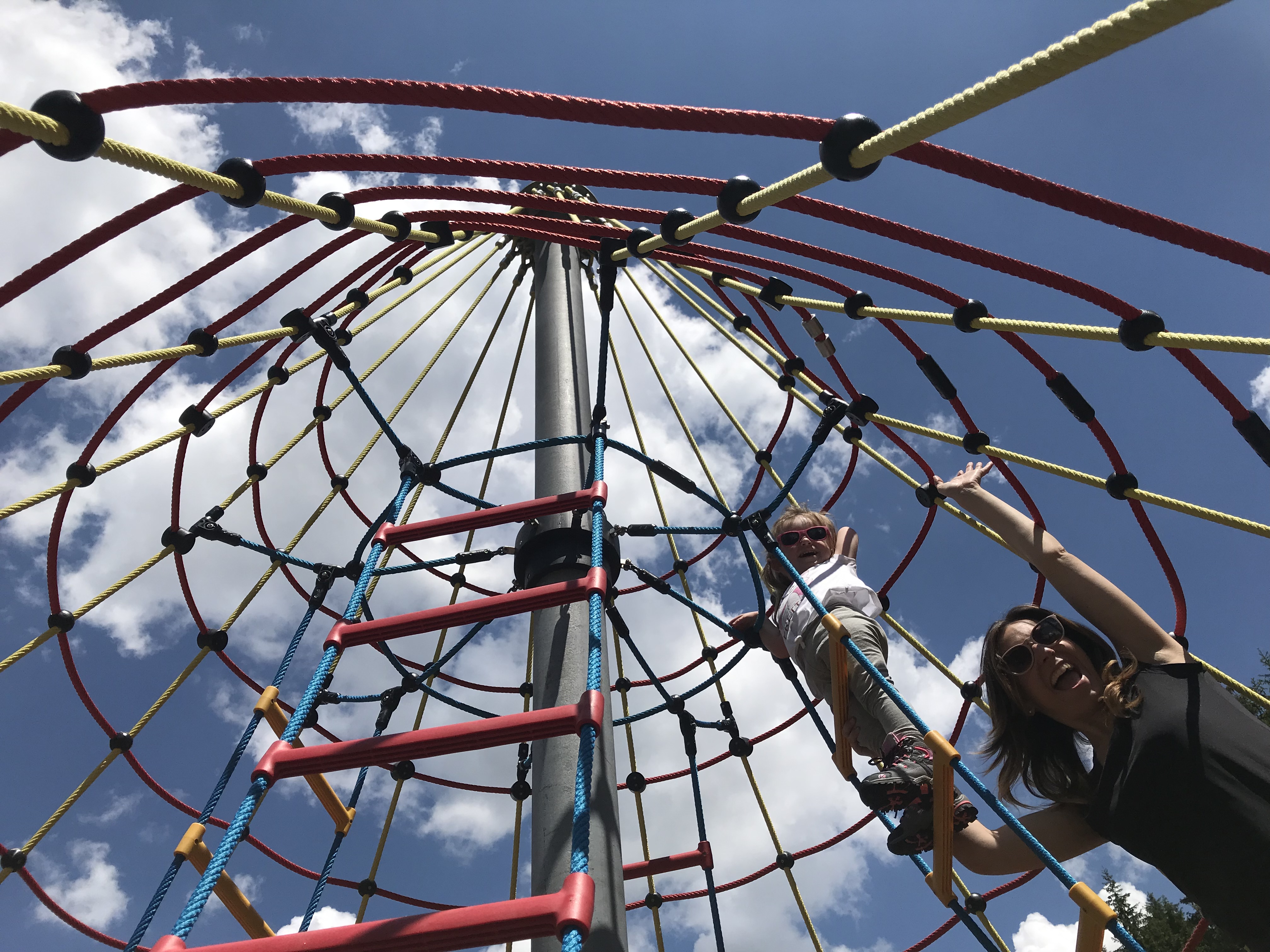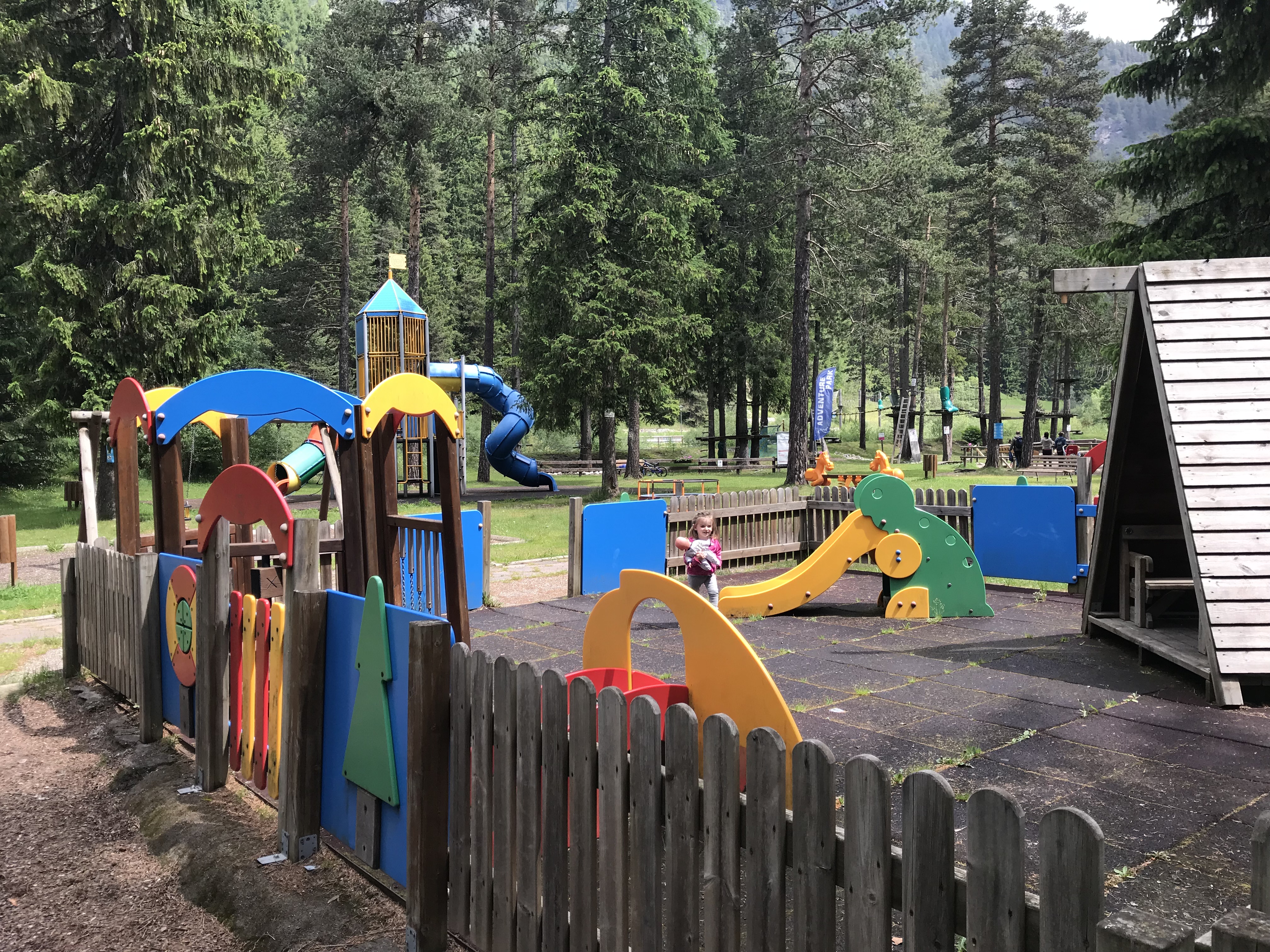 Al di la del fiume, in zona funivia Campitello, notiamo un gran parco giochi, con tanto di parco avventura. Attraversiamo il punte sul fiume, torniamo un po’ indietro e ci fermiamo. È il posto ideal per il nostro pic nic. Ci sono tanti tavoli all’ombra, quattro scivoli.. e perfino una zattera per attraversare un laghetto.