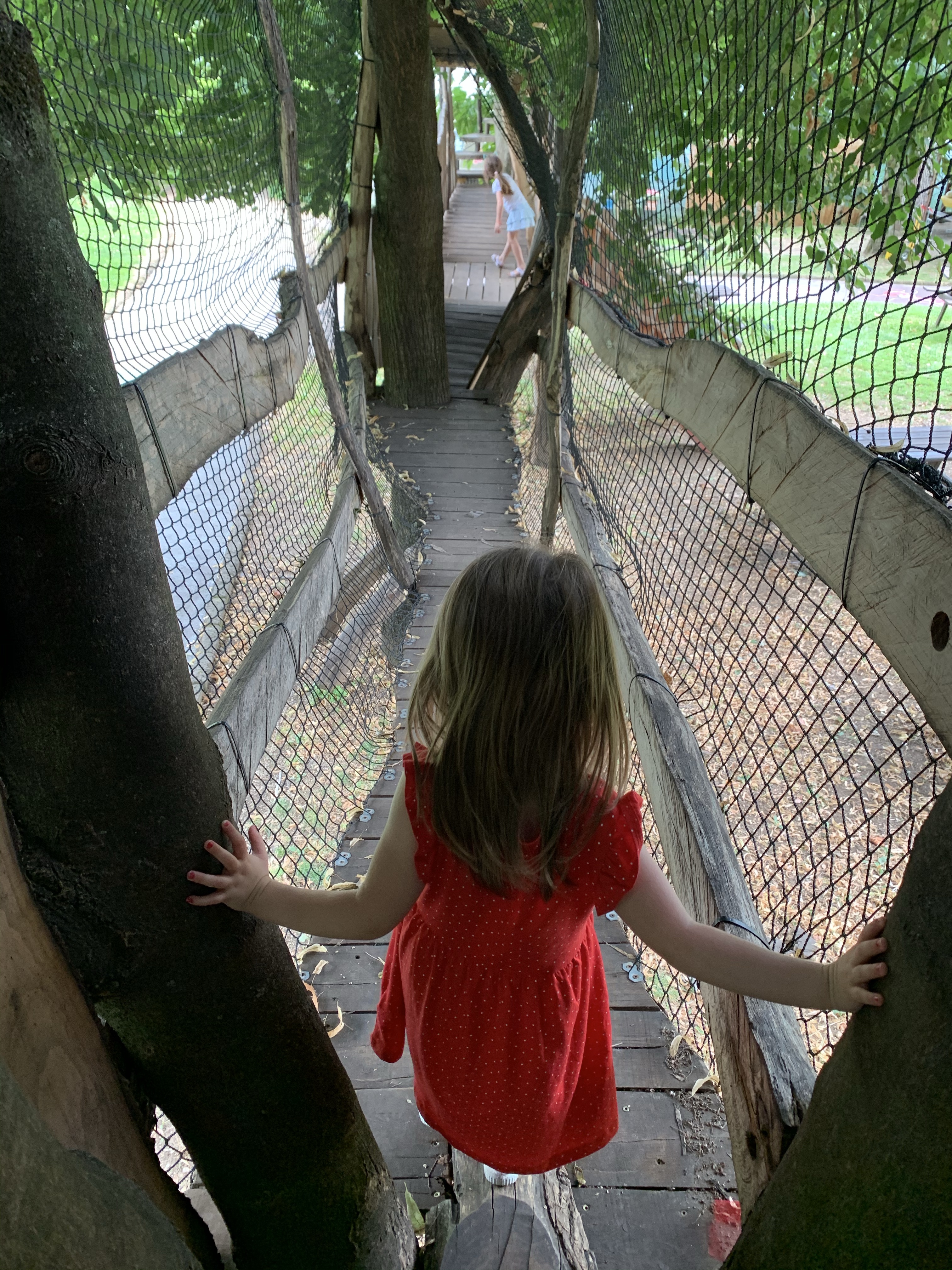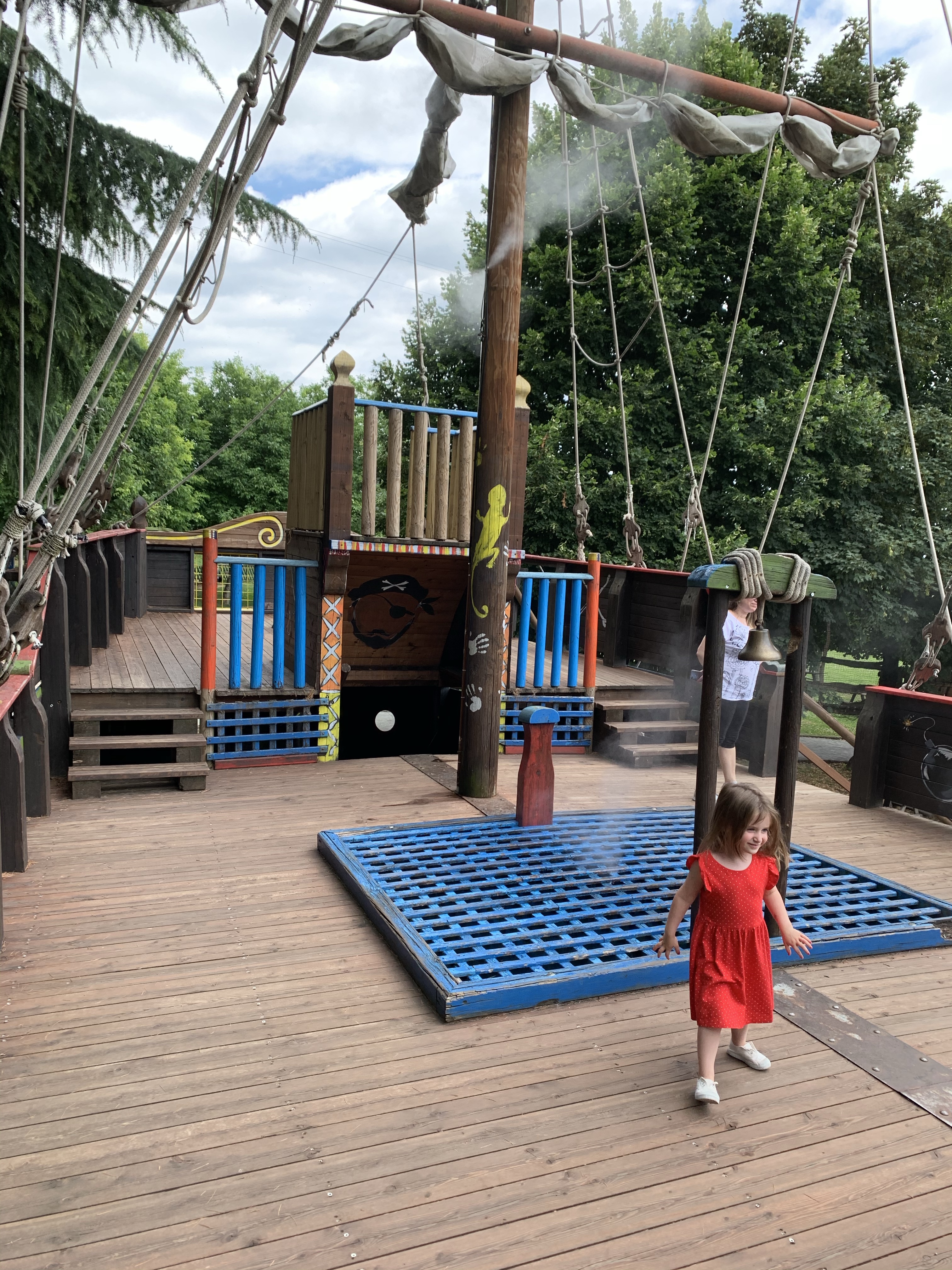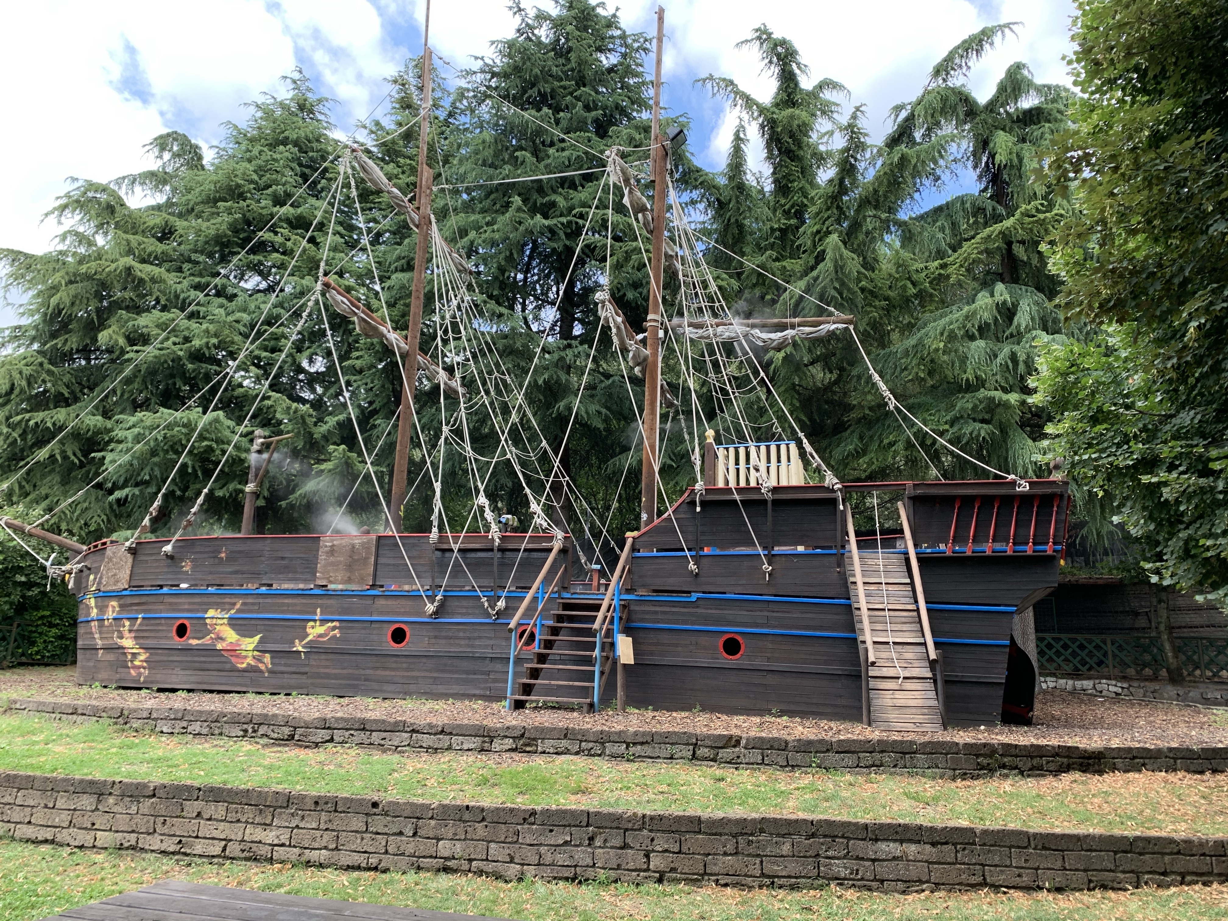 I giochi sono disolocati in tutto il parco e davvero ben tenuti: casette sull’albero, grande veliero sul quale su può salire, dotato di getti di acqua nebulizzata per rinfrescarsi in una giornata calda come questa.