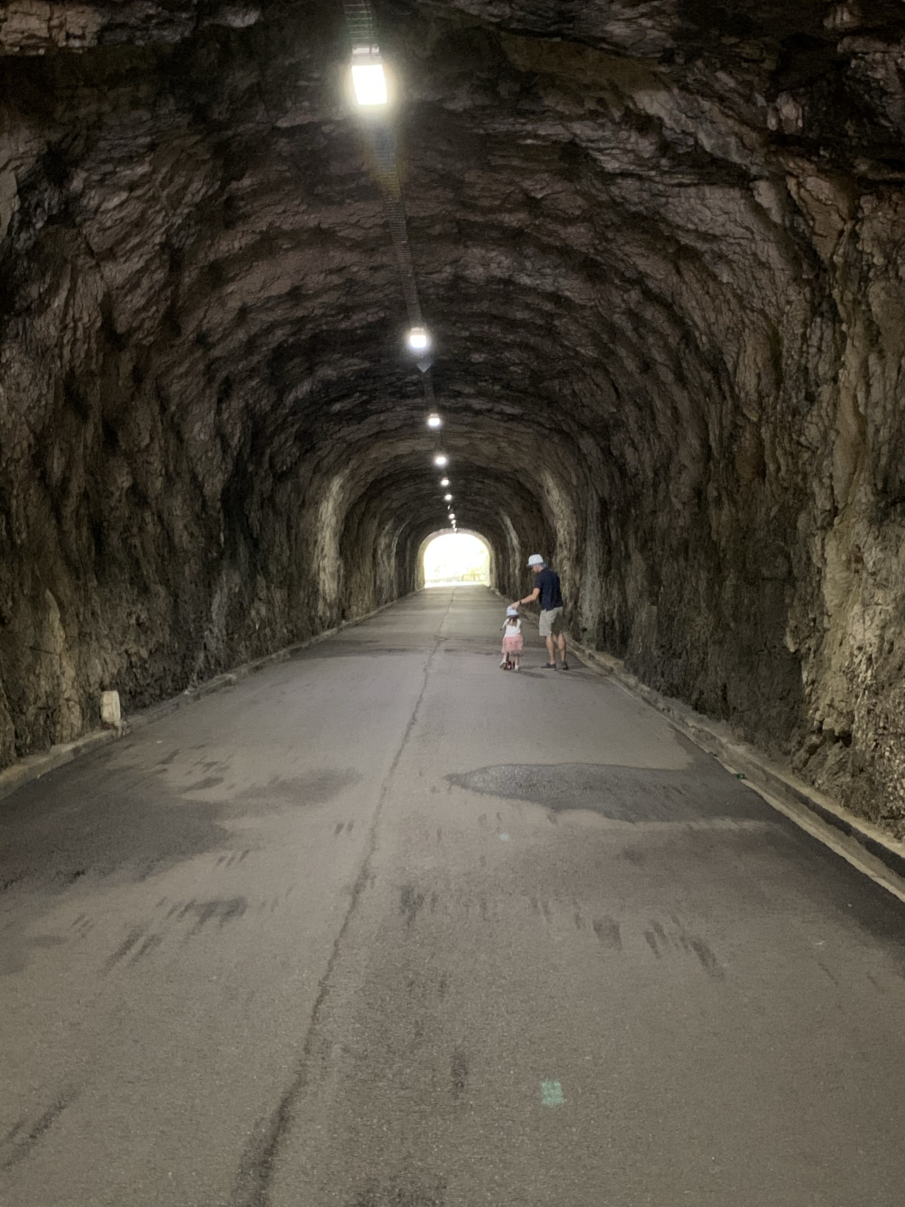 Come si diceva, la camminata inizia con un lungo e buio tunnel: da qui una lieve discesa conduce fino al ponte tibetano. La strada attraversa diverse gallerie (vero refrigerio in estate): sulla sinistra è protetta dalla montagna (che a volte sovrasta la strada), sulla destra scorre il torrente. Ogni tanto sporgetevi a scorgere il torrente e gli anfratti che questo ha creato nei millenni.