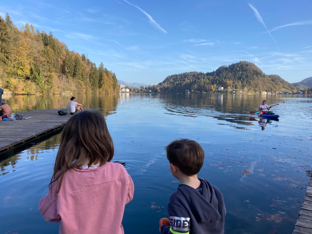 Una lunga discesa (che al ritorno sarà ripida salita) vi porterà in riva al lago. Abbiamo fatto il giro in senso antiorario, puntando subito l’isoletta con la chiesa. La passeggiata è per lo più all’ombra nel bosco. Arrivati alla spiaggetta del camping lasciate lo zaino per una foto: secondo noi da qui c’è al vista migliore del lago, con la chiesetta e il castello sullo sfondo. La passeggiata prosegue e poco troverete una bellissima passerella a pelo di lago (qui ci sono le uniche scale dell’intera passeggiata!).