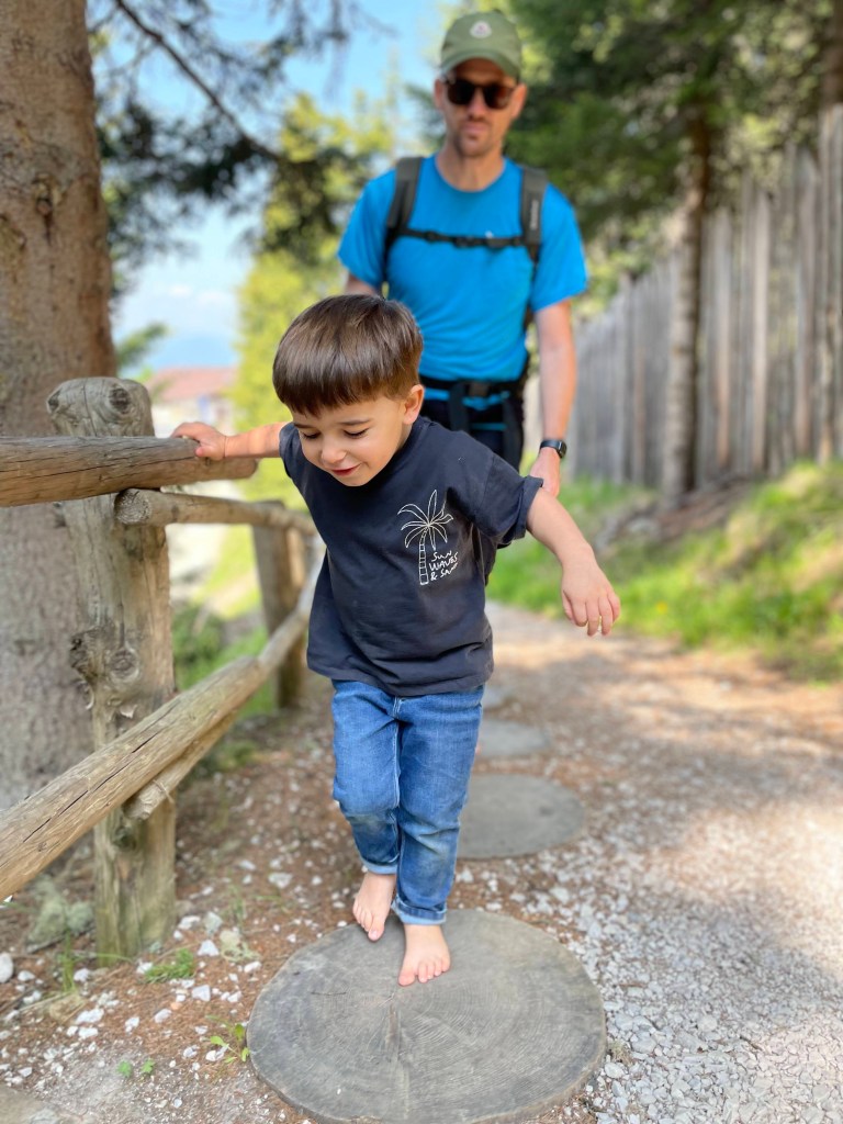 La salita è ripida ma, adatta a tutti i bimbi. Il sentiero è percorribile interamente a piedi nudi e si possono sperimentare le diverse superfici: il legno, la corteggia, la paglia, il truciolo, gli aghi.