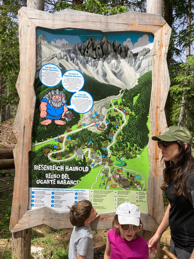La passeggiata inizia dalla stazione a monte della seggiovia. E’ quasi tutta immersa nel bosco e nel punto più alto porta a di fronte allo spettacolare Monte Baranci. Durante il cammino incontrerete molti oggetti che il gigante ha lasciato per strada: le posate, gli occhiali, un gran carretto, una botte… e persino l’orecchio e il naso. Sicuramente per i monellini non mancano i motivi per camminare, anche perchè la passeggiata non è semplice semplice in piano. La passeggiata dura un’ora abbondante.