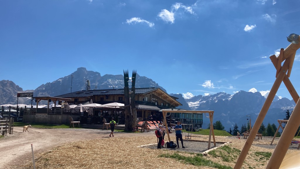 La funivia impiega circa dieci minuti per portarci a un’altitudine di 2078 metri. Sono le 10.00: all’arrivo, ci accoglie il sole e sullo sfondo la regina delle dolomiti, la Marmolada. Solo questo vale il prezzo del biglietto.