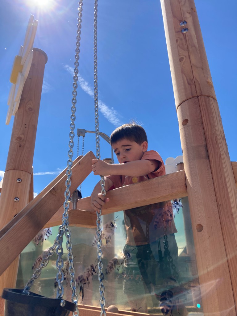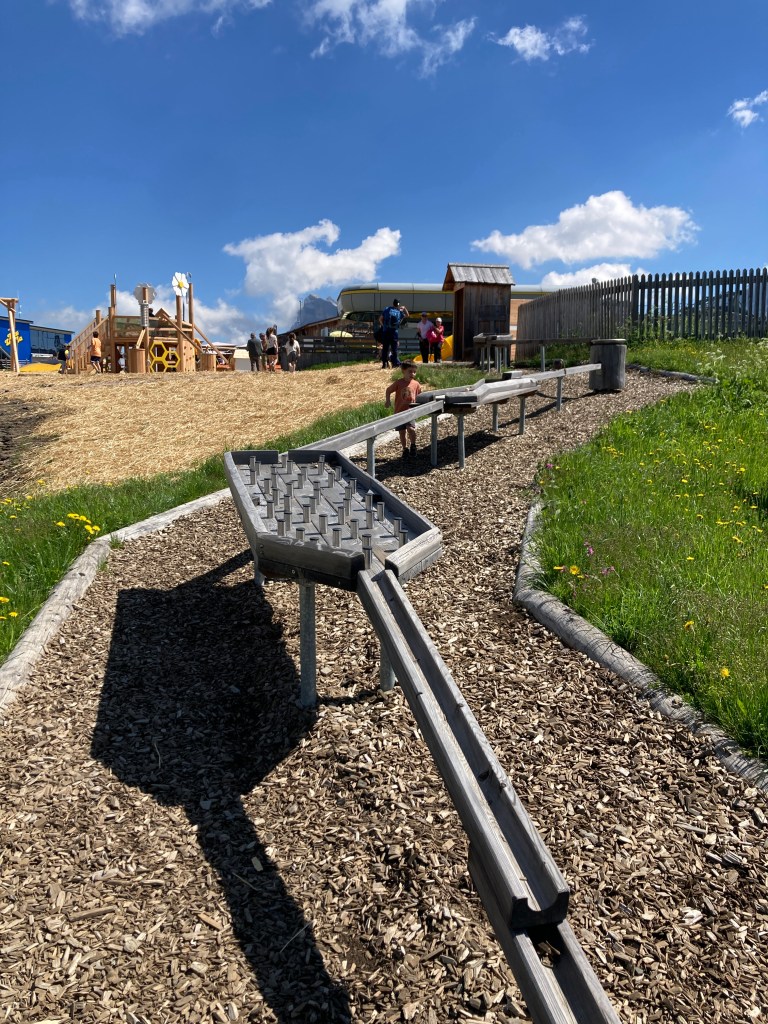 Noi “grandi” ci godiamo il panorama, mentre i nostri monelli sono già scomparsi in un immenso parco giochi, con giochi d’acqua, altalene, una grande struttura in cui arrampicarsi e nascondersi, un enorme palline su cui saltare