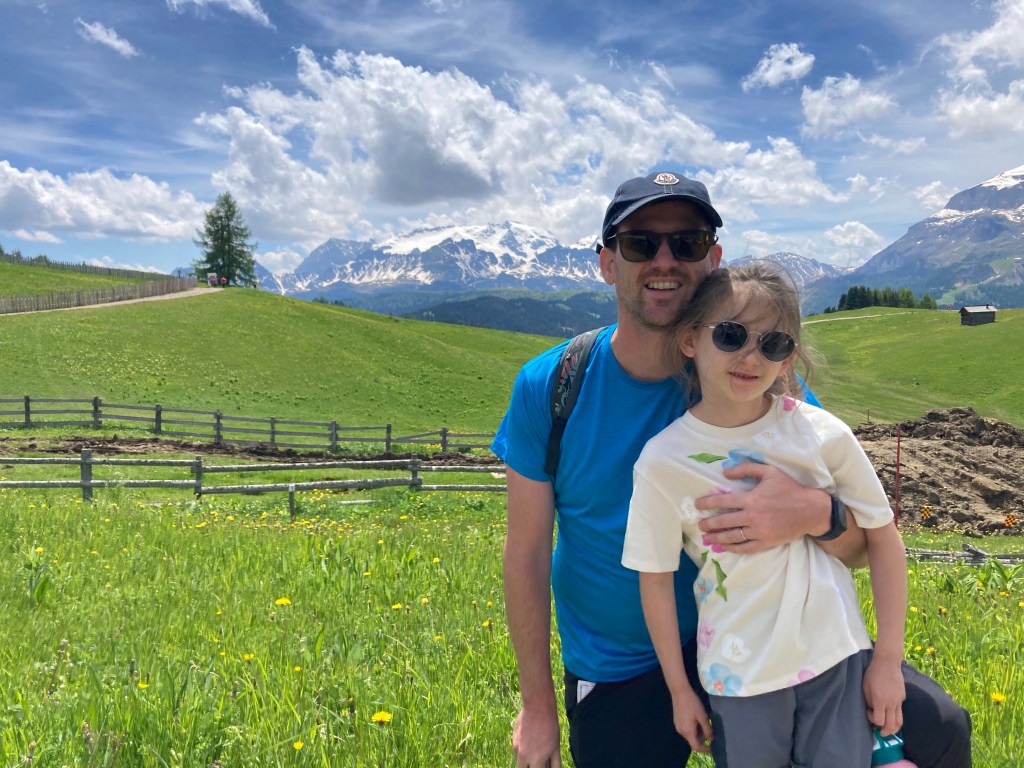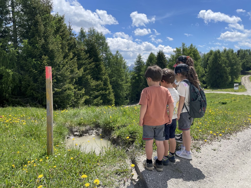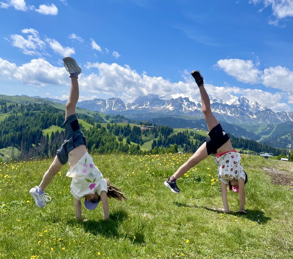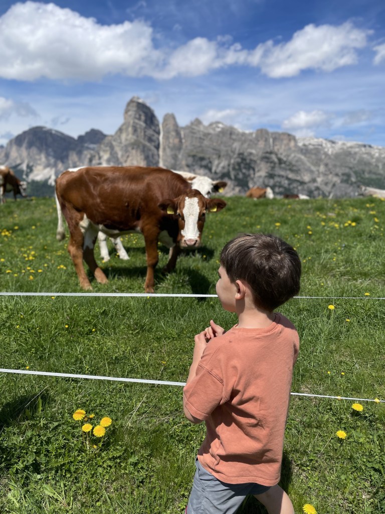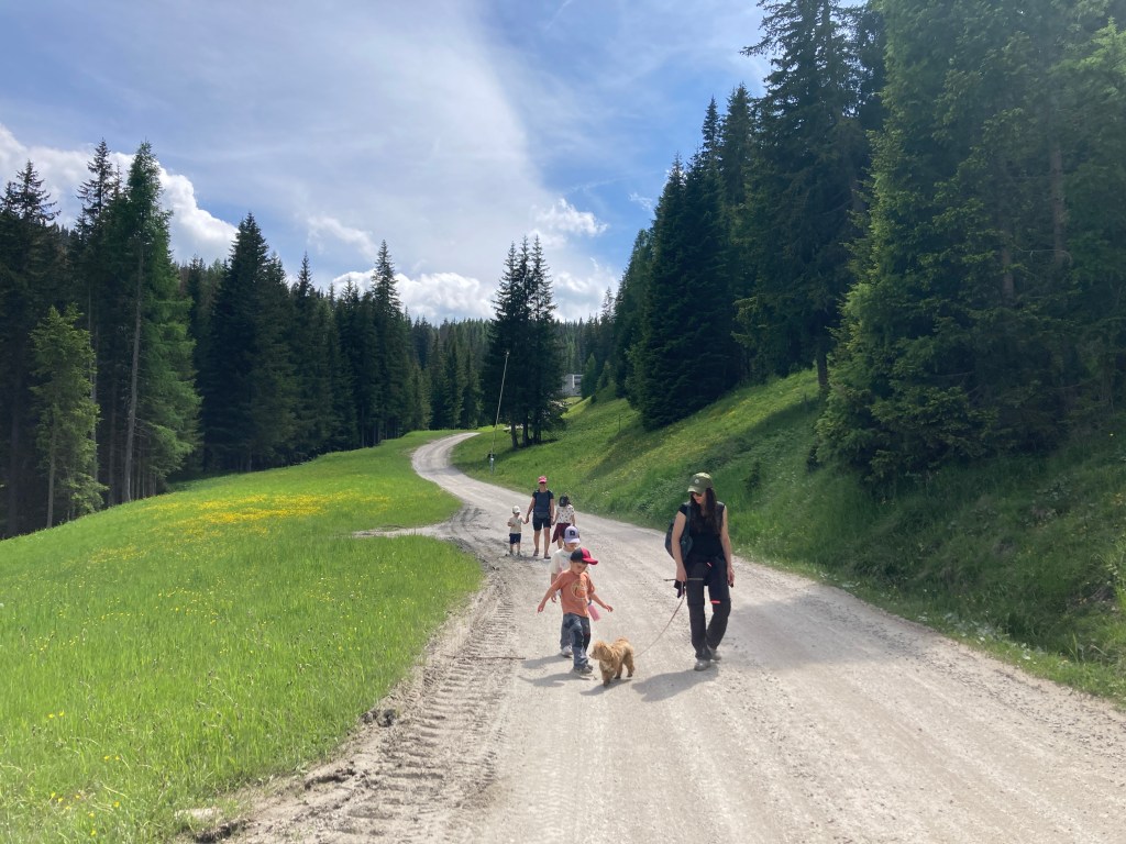 Prendiamo il sentiero che scende per circa un chilometro (100 metri di dislivello) fino al bivio che porta a valle: il panorama è mozzafiato. La strada in discesa attraversa splendidi pascoli dove Ale si diverte a chiamare le mucche. Le ragazze invece si esercitano a fare le ruote in sincronia: la Marmolada (più innevata del solito) le osserva.