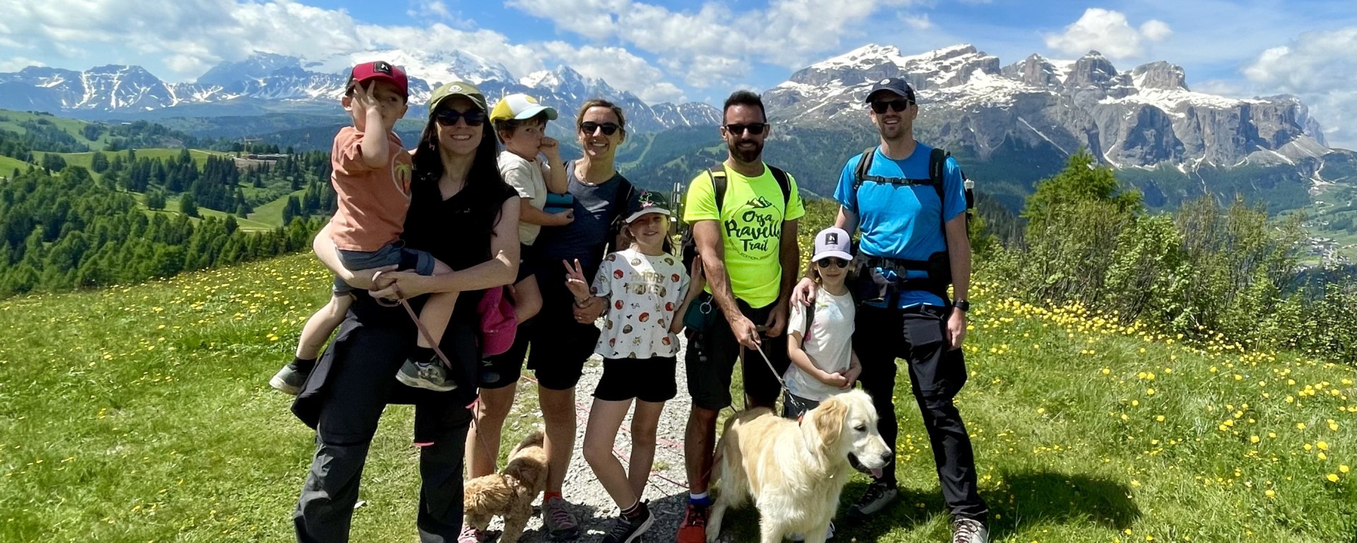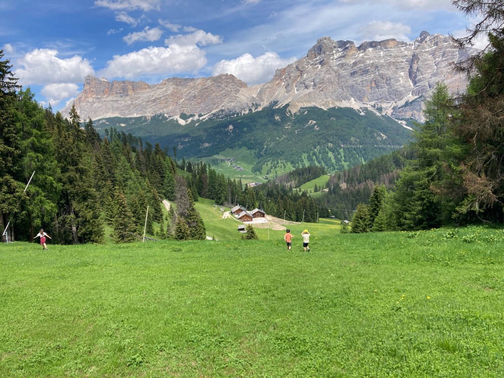 È ora di cominciare la discesa verso La Villa lungo una strada sterrata. Per rendere il percorso più avventuroso, prendiamo alcune scorciatoie lungo le piste da sci, tagliando i prati in fiore a zig-zag e fingendo di essere aeroplani. Ruzzoliamo, urliamo, ci schiantiamo a terra: correre sui prati è meraviglioso! E poi possiamo dire di aver fatto anche noi la Gran Risa, la pista della Coppa del Mondo.