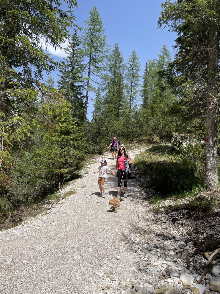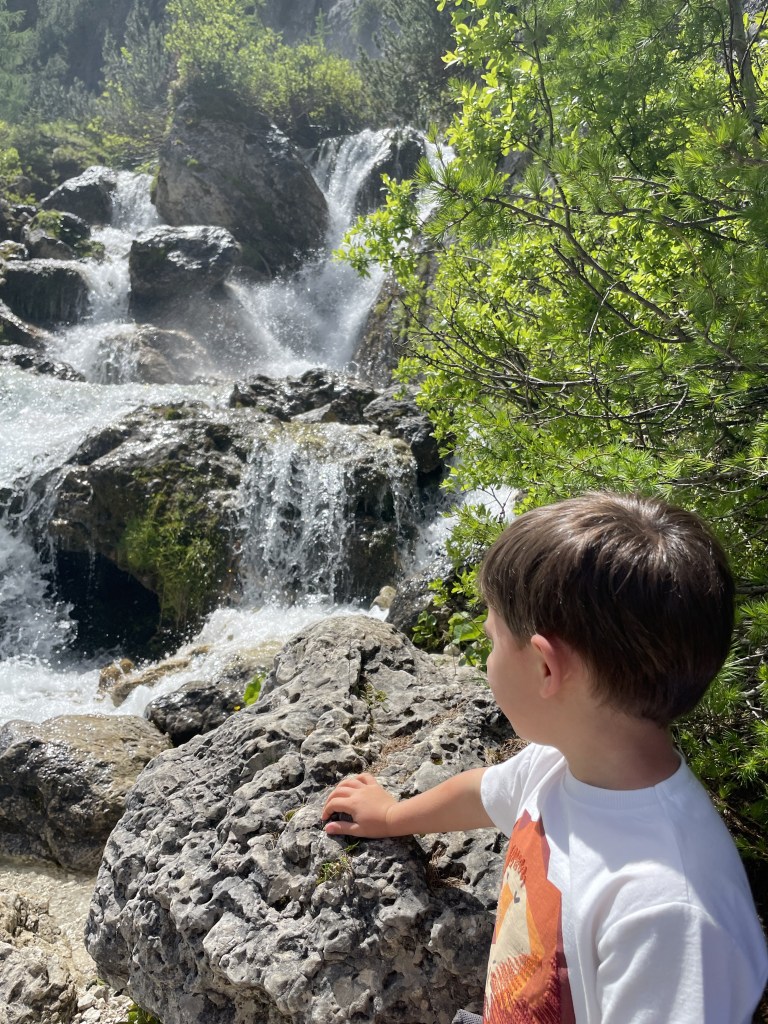 Abbiamo chiuso il percorso ad anello, tornando indietro attraverso un sentiero diverso: Ci siamo addentrati in un fresco bosco seguendo il torrente formato dalla cascata. I bambini si sono divertiti a osservare gli alberi, ascoltare i suoni della natura… e tirare i sassi nel torrente! Dopo una ventina di minuti, dopo aver attraversato due ponticelli, prendiamo una ripida discesa sulla sinistra: questo ci permette di arrivare al parcheggio attraverso un piccolo sentiero che taglia i prati.