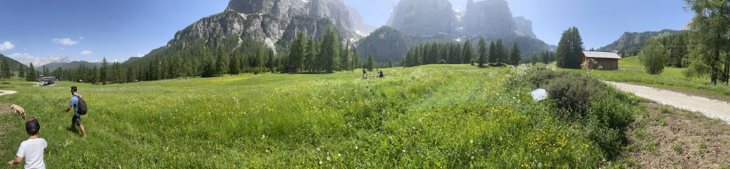 Lasciato il parcheggio La passeggiata inizia con una leggera discesa attraverso verdi prati. Già in lontananza, si scorge la cascata che scende maestosa dal Monte Sella. Questo primo tratto del percorso è perfetto per i bambini: si attraversano i prati pieni di fiori e in poco tempo si arriva ad una spianata con tavole e alberi per fare pic nic. La casata è proprio a pochi passi. Abbiamo steso le coperte, tirato fuori i panini e goduto di un momento di relax in mezzo alla natura.