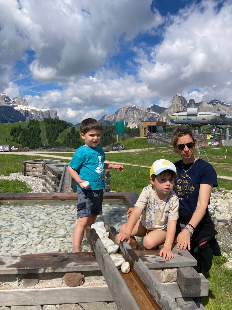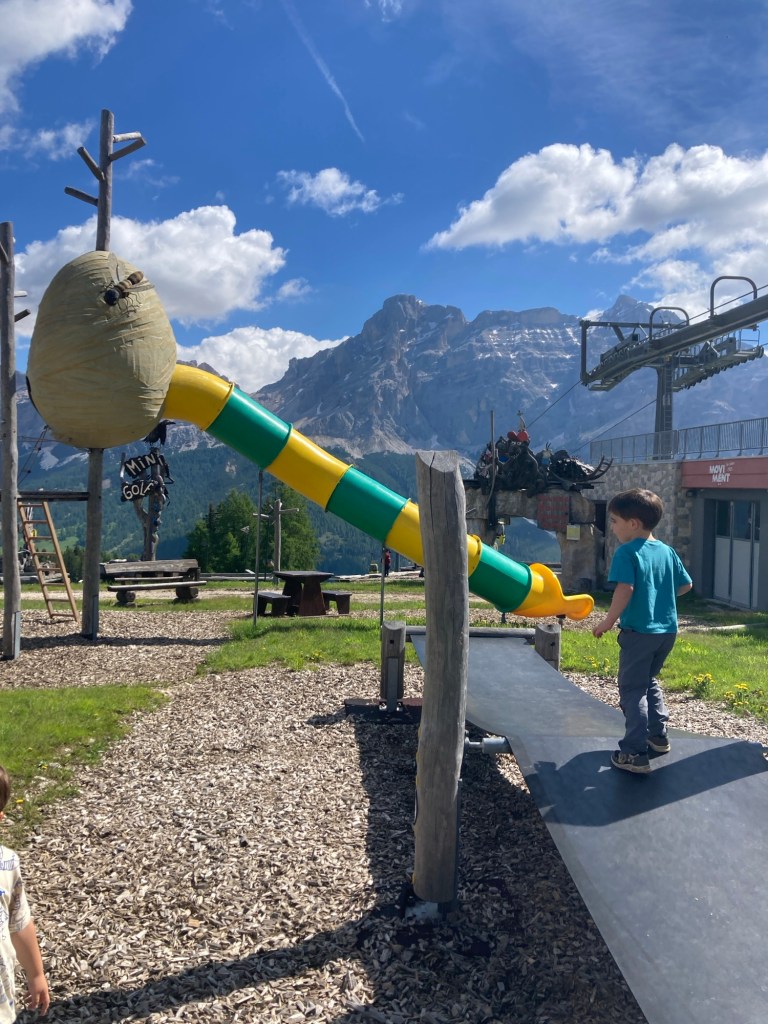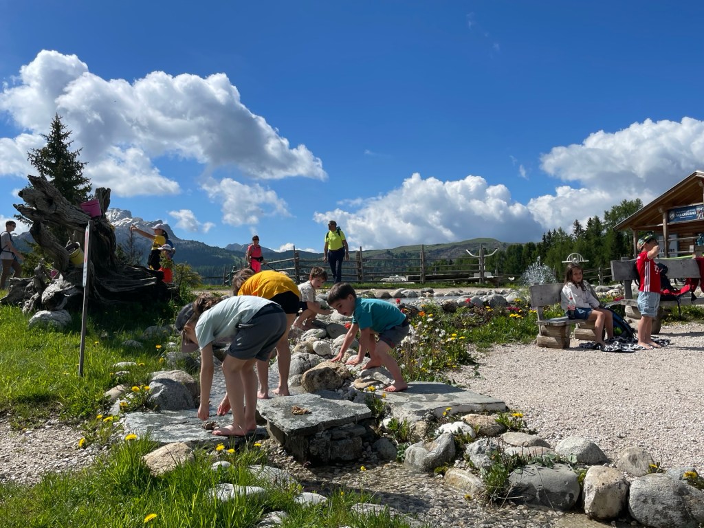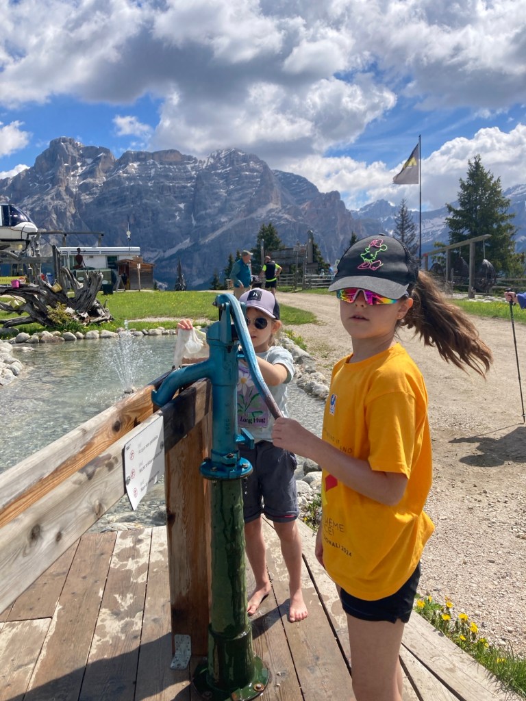 L’escursione inizia con un’emozionante corsa in ovovia fino a Piz Sorega. Una volta in cima, ci accoglie un rifugio accogliente e uno dei famosi parchi Movement. Qui, i bambini possono divertirsi con giochi d’acqua e altre attività all’aperto.