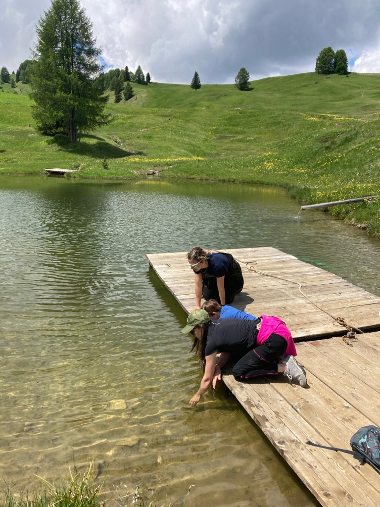 Arriviamo a un laghetto, un vero e proprio microcosmo di vita. I bambini sono affascinati dai girini e dagli avannotti che nuotano nelle acque tranquille. Dopo una breve pausa, proseguiamo lungo il sentiero e troviamo una fontana dove possiamo rinfrescarci.