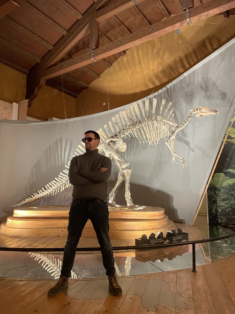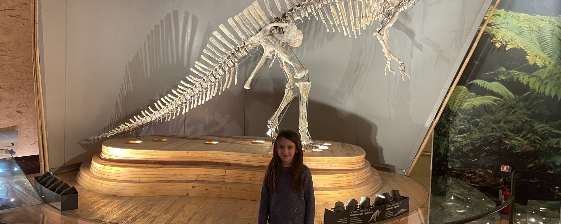 L’area dei dinosauri. All’ingresso, i visitatori sono accolti dallo scheletro magnificamente ricostruito di un Ouranosaurus nigeriensis, un dinosauro erbivoro del Cretaceo, lungo circa 7 metri, noto per la sua distintiva vela dorsale. Accanto, si trova lo scheletro di un gigantesco coccodrillo preistorico, il Sarcosuchus imperator, lungo oltre 11 metri, che dominava le acque dolci africane circa 110 milioni di anni fa