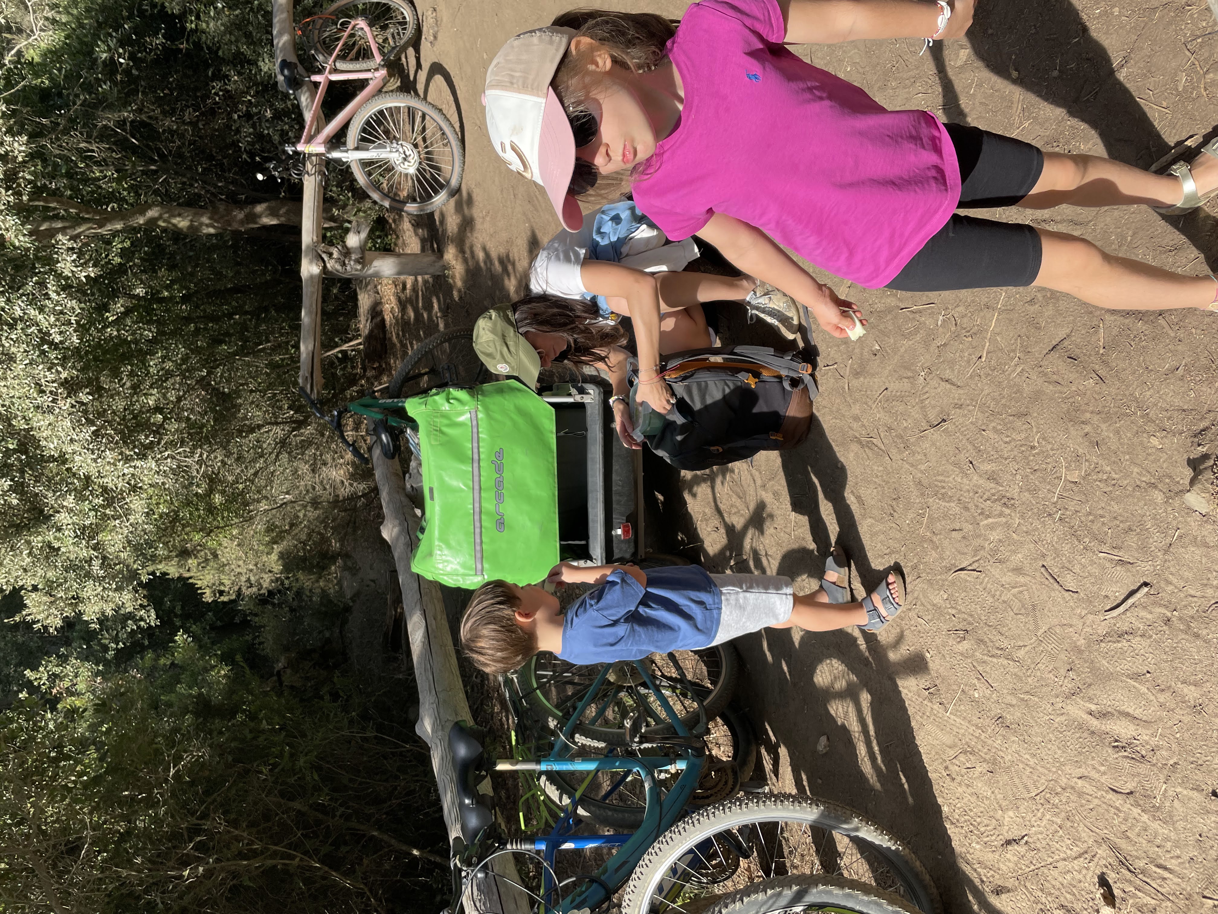 La strada per la spiaggia è interamente sterrata, ma ben battuta e facilmente percorribile anche con il carretto. Tuttavia, è importante sapere che il percorso è caratterizzato da diversi saliscendi, che in alcuni tratti ci hanno costretto a scendere e spingere le biciclette a piedi.