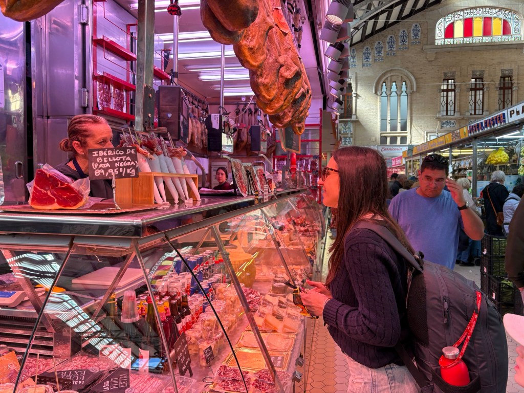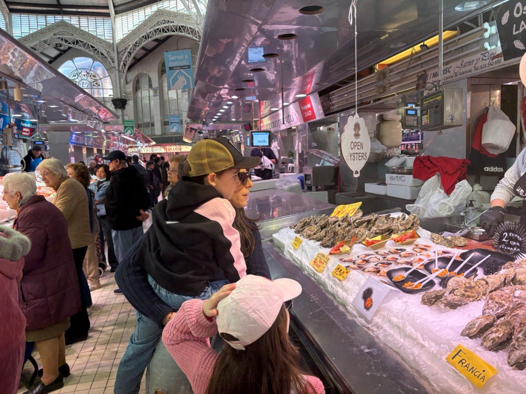 La Lonely Planet suggerisce di salire su un terrazzo… ma il ristorante a 5 stelle ci ha fatto fare due passi indietro e così ci siamo diretti verso quello che è un vero e proprio tempio del gusto: il Mercato Centrale. Entrare qui non è come andare in un banale supermercato; è un’esperienza sensoriale che lascia a bocca aperta sia i grandi che i monellini. Sarete circondati da altissime colonne e vetrate colorate, ma il vero spettacolo è alzare lo sguardo verso le cupole giganti in ferro e ceramica che inondano tutto di luce naturale. All’interno si respira un’aria autentica e frenetica, nulla di turistico: vedrete i residenti scegliere con cura il pesce freschissimo o i legumi per la paella. Troverete distese di frutta coloratissima, spezie profumate e, naturalmente, i famosi prosciutti appesi che fanno subito “Spagna”.